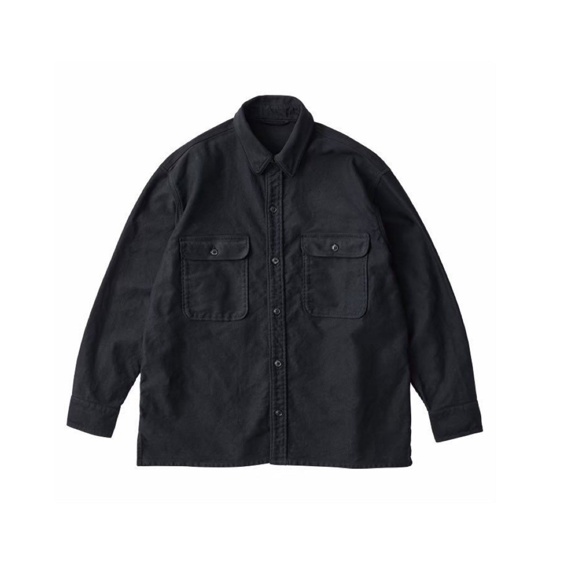 モールスキンシャツ シャツ型のジャケットはどんなインナーの上に羽織っても万能のスタイリング。